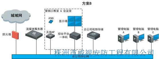 方案B,可通過對訪問人員的授權,實現對分布在全國各地營業店的不同訪問權限;同時可在總部內部搭建一套營銷示教系統,總部銷售總監、銷售培訓主管可以利用該平臺,對各區域督導進行實戰培訓,系統可通過iPAD直接控制顯示墻,方便授課人員靈活操控。系統架構圖如下: